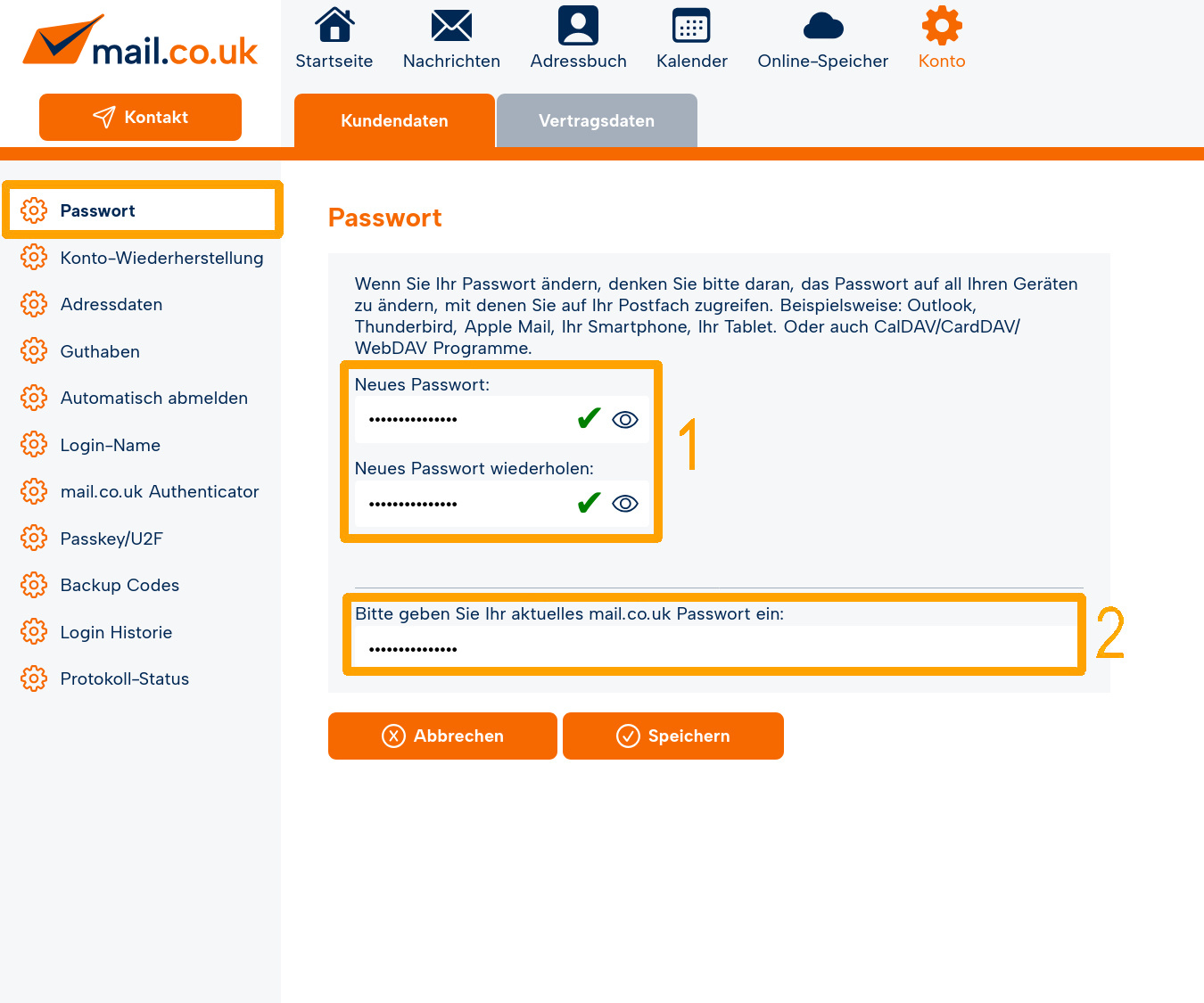 Um die Änderung zu bestätigen, geben Sie in das betreffende Eingabefeld Ihr aktuelles Passwort (2) ein.