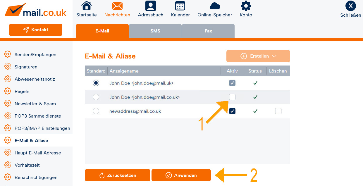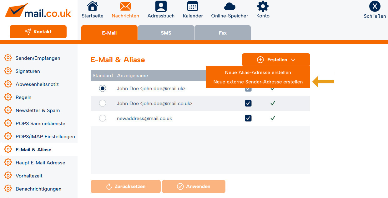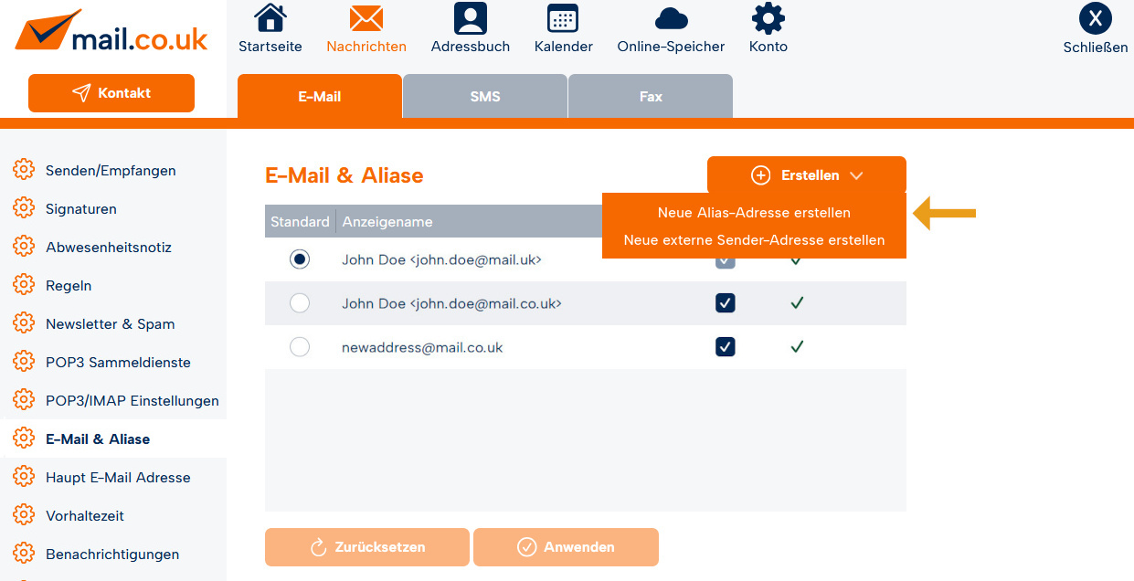 Eine Alias-Adresse ist eine weitere E-Mail-Adresse, die Sie sich einrichten können, wenn Sie unter verschiedenen E-Mail-Adressen erreichbar sein und trotzdem nur ein mail.co.uk Postfach nutzen möchten. Alle an Ihre Alias-Adresse(n) gerichteten E-Mails empfangen Sie in Ihrem mail.co.uk Postfach, was die Verwaltung sehr einfach macht. Beim Antworten auf eine E-Mail, die an eine Alias-Adresse gesendet wurde, wird automatisch die Alias-Adresse als Absender verwendet. Beim Verfassen einer E-Mail können Sie Ihre Alias-Adresse als Absender verwenden. Abhängig von Ihrem genutzten mail.co.uk Produkt können Sie bis zu 25 weitere E-Mail-Aliase anlegen.