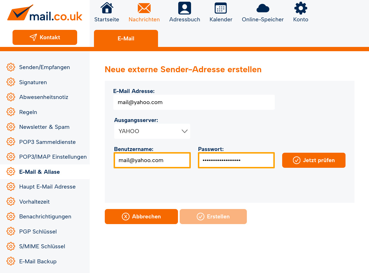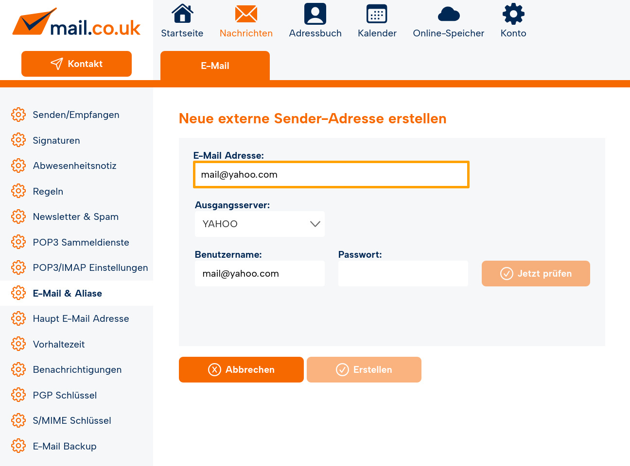 Sie haben die Möglichkeit, aus dem mail.co.uk Webmailer heraus, E-Mails über Ihre E-Mail-Adressen anderer Anbieter zu versenden. So können Sie zum Beispiel bequem Nachrichten über Ihre Gmail- oder Yahoo!-Adresse versenden, wie auch über Ihre eigene Domain. Sie müssen diese externen Sender-Adressen lediglich einrichten.