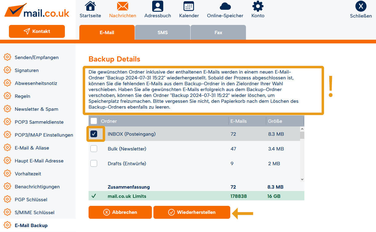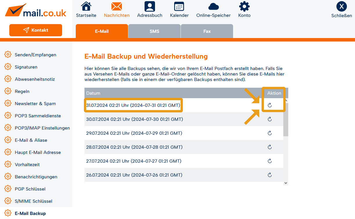 Aus Sicherheitsgründen sichert mail.co.uk einmal täglich die E-Mail-Ordner. Als mail.co.uk-Kunde können Sie nun auf