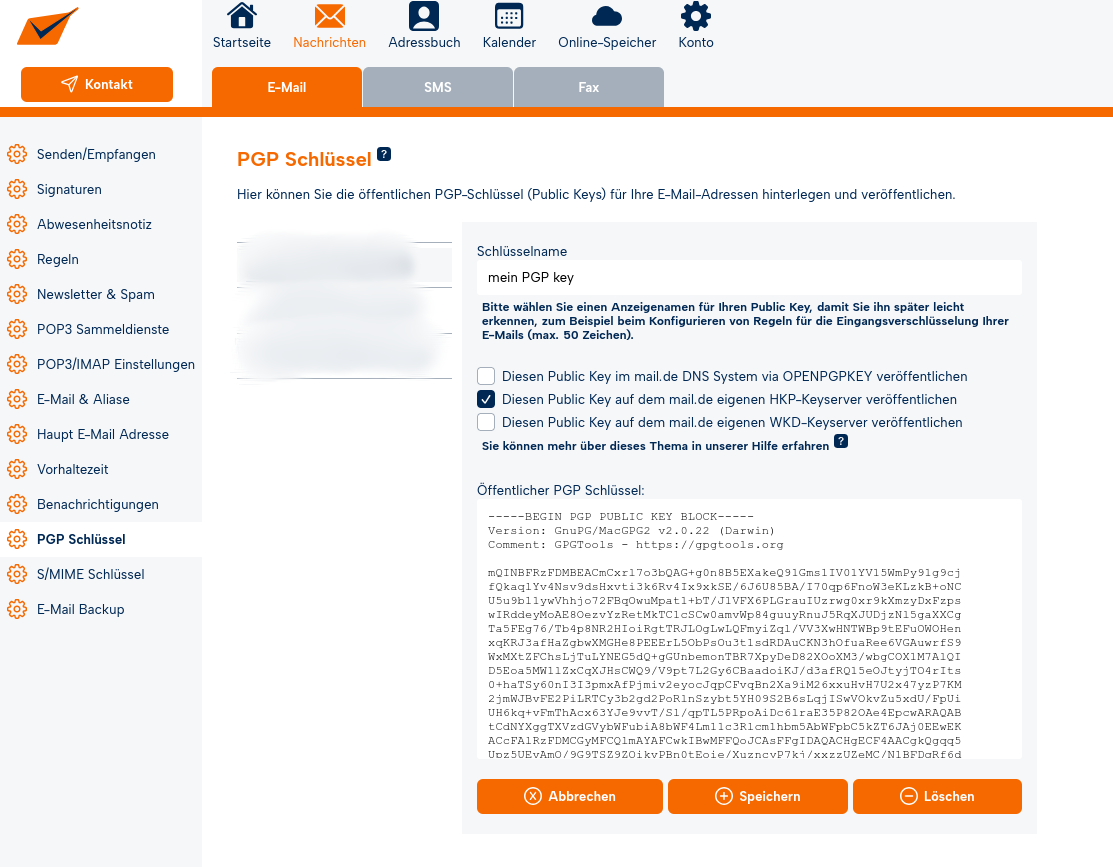Wenn Sie einen Public Key aus dem mail.de System entfernen möchten, entfernen Sie das jeweilige Häkchen und klicken auf "Speichern". Sollten Sie Ihren Public Key löschen, so wird dieser automatisch aus dem mail.de DNS-System, vom mail.de HKP-Server oder vom WKD-Server entfernt.