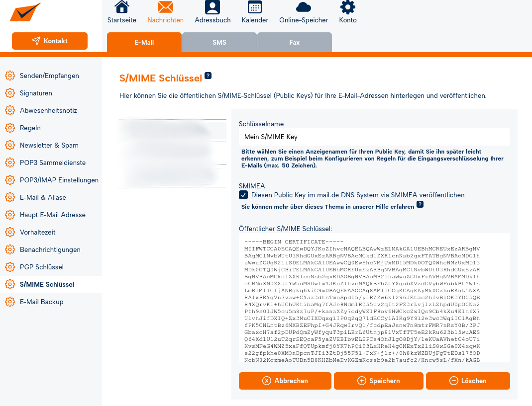 SMIMEA ist ein Ansatz, den Schlüsselaustausch, beziehungsweise die Bereitstellung Ihres Public Keys sicherer und für Sie einfacher zu gestalten ( SMIMEA-Draft der IETF). Auf diese Weise können Sie für Ihre mail.co.uk E-Mail-Adresse und den zu Ihrem Konto erstellen Alias-Adressen den jeweiligen Public Key im DNS von mail.co.uk veröffentlichen. Über diese Vorgehensweise ist gewährleistet, dass der zu Ihrer mail.co.uk E-Mail-Adresse veröffentlichte Schlüssel auch wirklich von Ihnen bereitgestellt wurde.