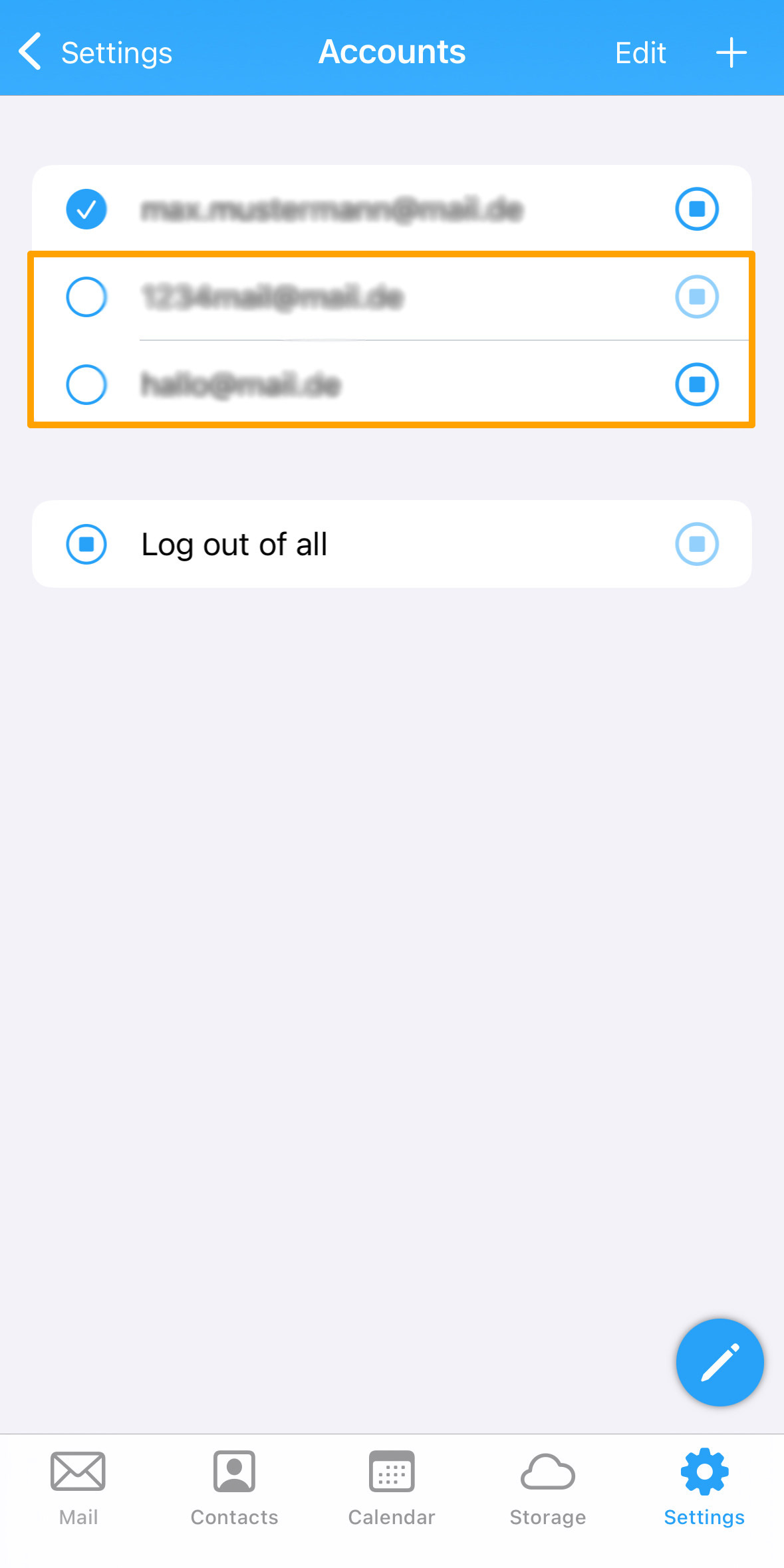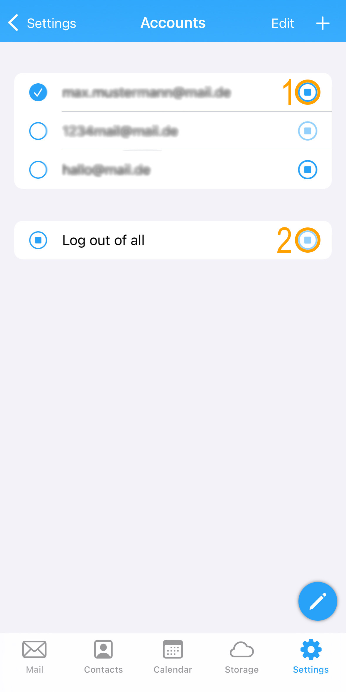 - You will now see all accounts listed. In the row of email accounts, there is a round icon with a square in the center — this is the logout button. (1)