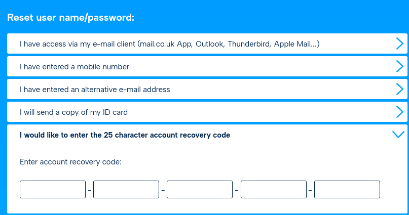 In your mail.co.uk account, you can generate a 25-digit code and use it to reset your password via this option. The code is generated in the mail.co.uk Setup & Security Assistant.